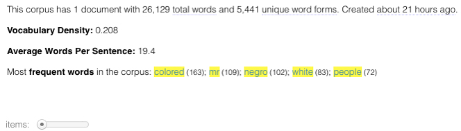 Figure 3 shown above is the relative frequency of a few of the most frequently used words throughout the articles. The difference between this figure and the previous figures is that this graph shows when the words are used in the text, not just what the words actually are. This information can show an important trend of what the articles are discussing. For example, at the beginning of the articles we can infer that the word “colored” is used more often than the rest of the piece work.