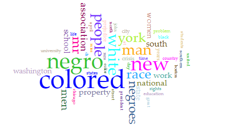 Figure 1 above is a screenshot taken of the Cirrus of most of the commonly used words in “The Crisis”. Each word has a different color that doesn’t have any correlation – it seems to just be random – but this is helpful because it differentiates between all words and isn’t bland to look at. The larger the word is, the more commonly it is used in the text. Therefore, the most commonly used word is “colored”, with “negro”, “new”, “white”, and “people” close by.