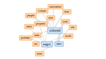 Figure 2 is the screenshot above showing the links between the three most commonly used words – in blue – and the multiple other words – in orange – that are oftentimes next to each other throughout “The Crisis” articles. The most commonly used independent words are “colored”, “negro”, and “new” – similar to Figure 1 – but the grey lines indicated the words that these three are often connected to and follow after.