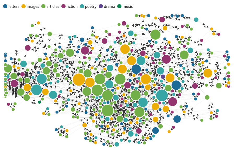 Overall, while I find the Flourish tool to be useful in answering very specific research questions, when it is used, in particular this network graphing visualization tool, creators and users alike should consider the various ways that the visualization may not be as wholly representative as desired and could in fact produce misleading conclusions and take-aways. When working with data such as issues of The Crisis (which includes a variety of page lengths and content genres) in the aggregate as in this visualization, the aspects that made each issue unique (such as the inclusion of varied materials), may get lost in the visualization.