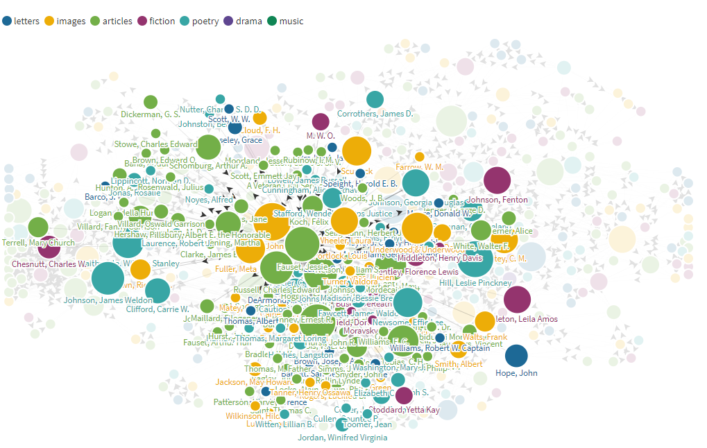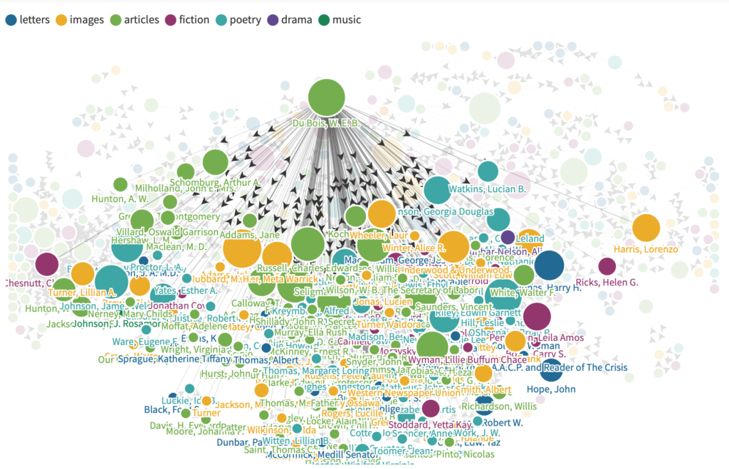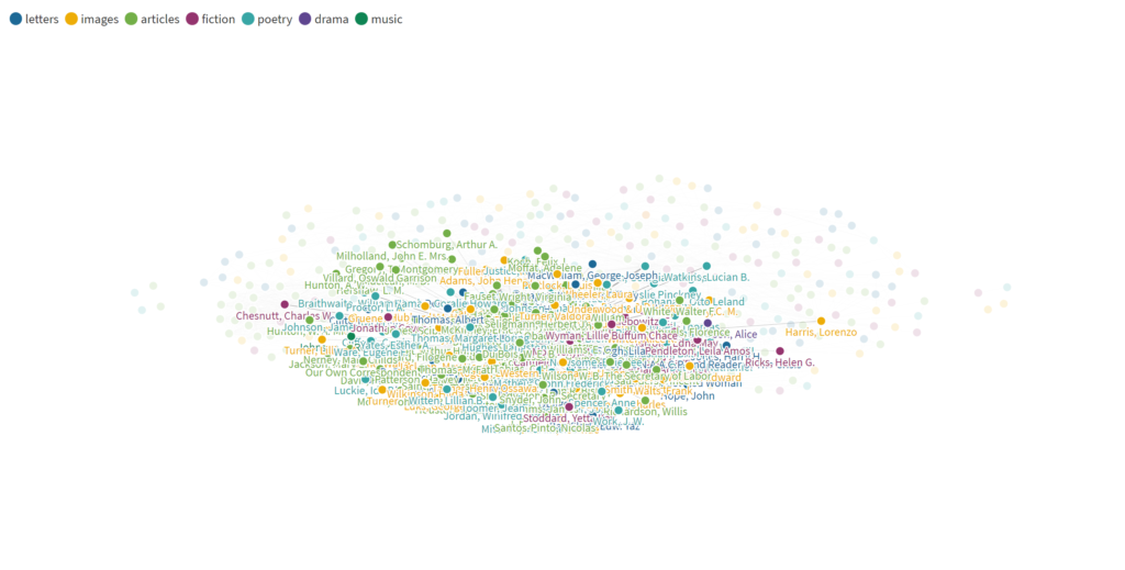 The above Flourish graph shows the connections between every author within “The Crisis” and how each one has a relationship with each other given certain similar topics and mentions as well as written relationships. The larger the dot, the more this author has written throughout the 10-20 years of this articles existence. Each different colored dot represents a different aspect of “The Crisis”, in which the author focused on that kind of information the most during his writings. The key can be found at the top left portion of each figure; Blue represents letters that the author collected and documented, yellow as images, green as articles, purple as fiction, light blue as poetry, dark blue as drama, and finally dark green as music. Even before analyzing more information about the certain authors, I think it is safe to conclude that images and articles were the most prominently used genre for each author, and that could relate to the author that wrote within the genre.