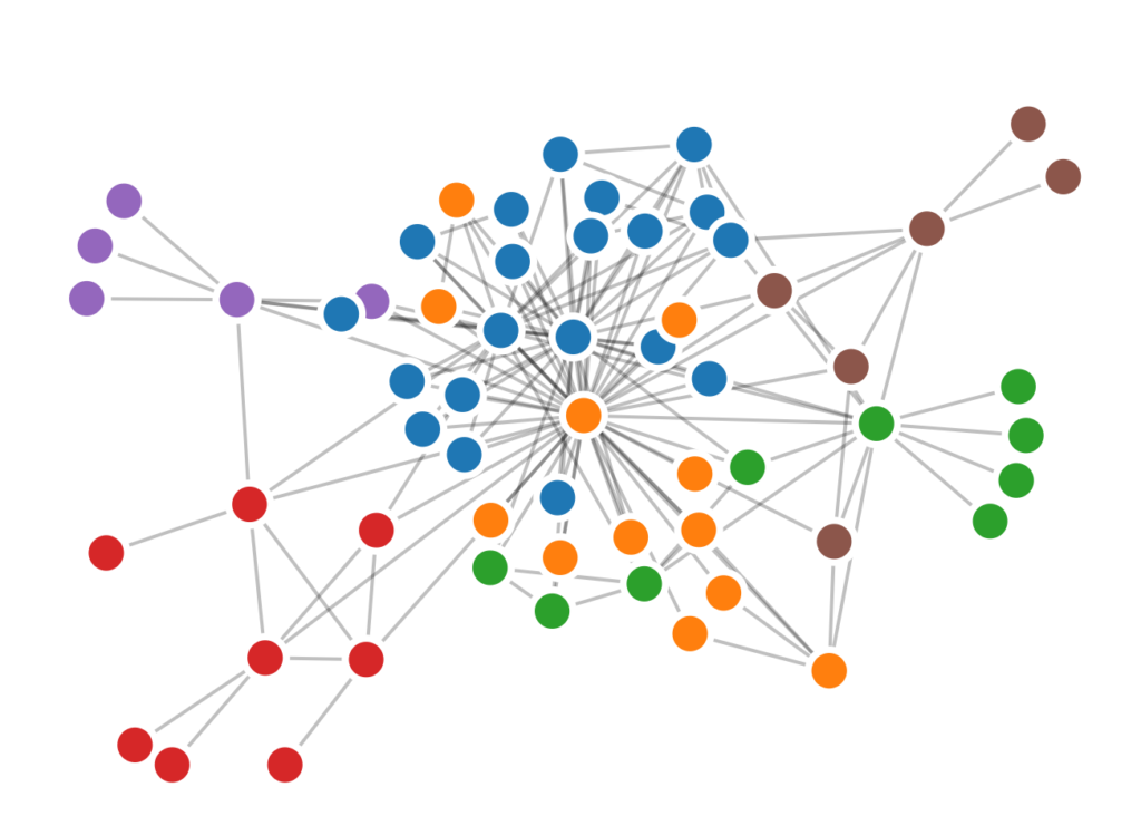 We can gather information though this image by seeing the connection to the different people and the dot color represent the different type of content. We can see the connection to the author is relatively less if we compare another author.