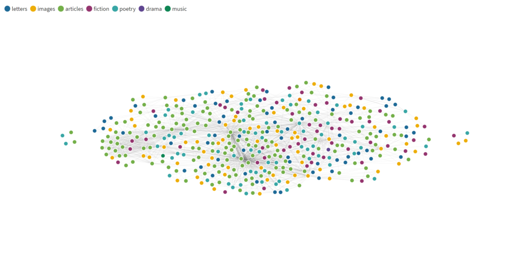 After reviewing Flourish and its uses, I was pretty interested in how the tool could be used to connect the different types of authors and publications to one another. There are so many authors who were writing different types of works who were connected to each other, as was shown in the network map.
