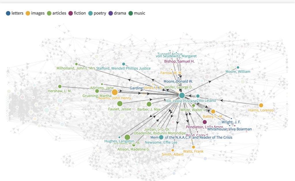 Well, for one Du Bois was one of the founders of The Crisis so right off the bat he has an advantage. Now as one can clearly see, by highlighting over W.E.B Du Bois, he is connected to nearly every author, so much that the lines and the thickness don’t show up. Only the biggest circles can be seen. I intentionally wanted to show how intense all the interconnectedness can be. This cluster was shown when clicking on Du Bois’ tab, which was blue (articles). So is that it? Should someone just write articles to become the most popular? Du Bois was indeed writing a lot of articles, but also for a long time too.