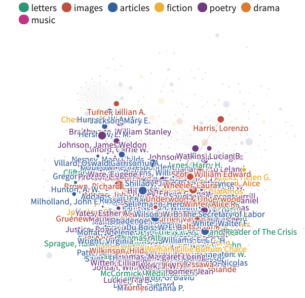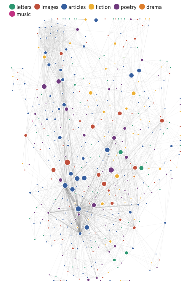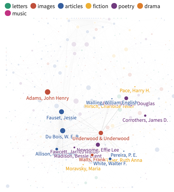When looking at Madeline G. Allison for instance, she is very interconnected but she has a smaller circle than Underwood & Underwood. To be clear hers is the blue circle dragged down in the left corner. Why is this? Well in this instance, she will likely have been with The Crisis for longer than Underwood & Underwood and has more connections to other authors. In short, the longer you are writing and the more connected you are to authors at The Crisis, the bigger your circle and the more connections you will have. On the question of what you should write about, i.e. articles, fiction or poetry seem to be some of the most popular. So stick with those.